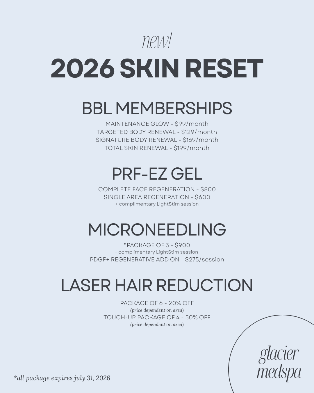 Current SpecialsGlacier Med Spa is proud to offer monthly specials to help you feel and look your best! View fullsize Call: 406.862.5174 Schedule Appointment Online